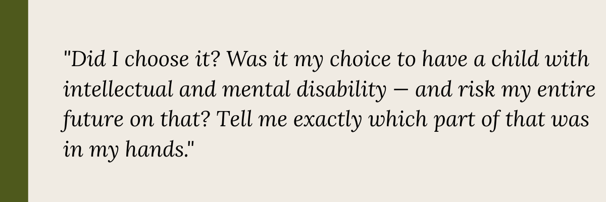 What nobody tells you is what happens when the sacrifice doesn't produce an acceptable return. My children were not diagnosed until they were three and one and a half years old. I did not choose disability. I did not choose children who, as they approach their teens, cannot wipe themselves. Who will never marry. Never hold a job. Never build anything. Who will consume, and then, statistically, die sometime in their thirties.